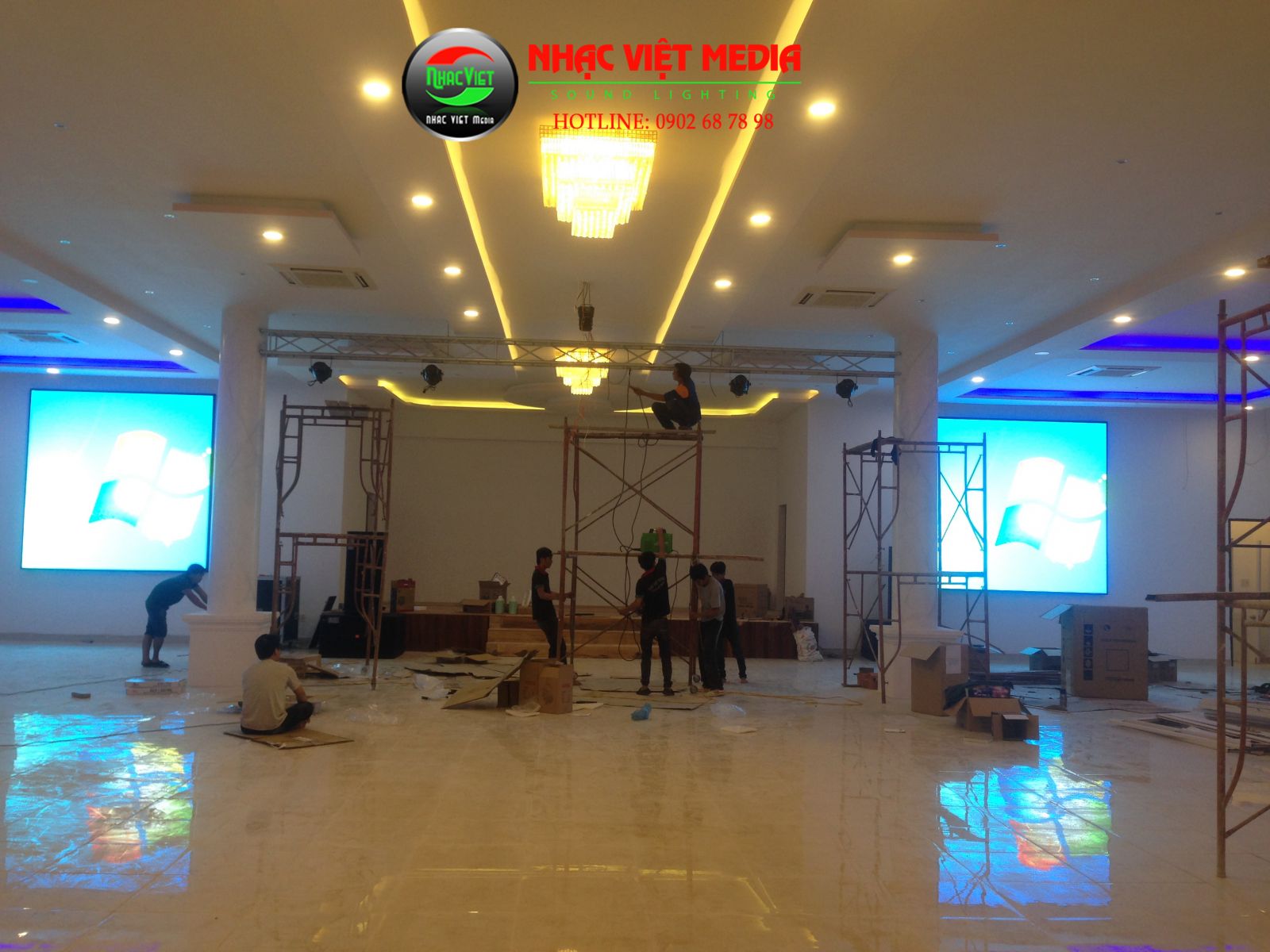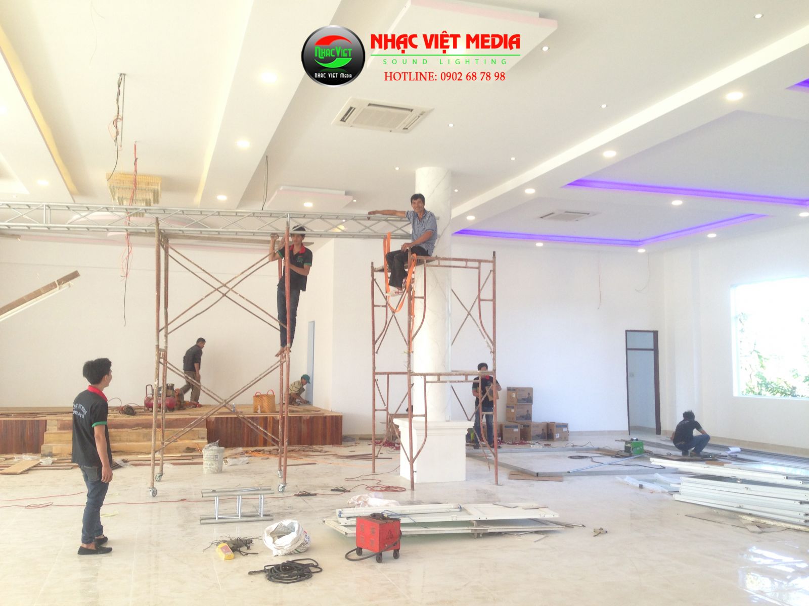 Hệ thống âm thanh ánh sáng màn hình led đang được lắp đặt tại công trình